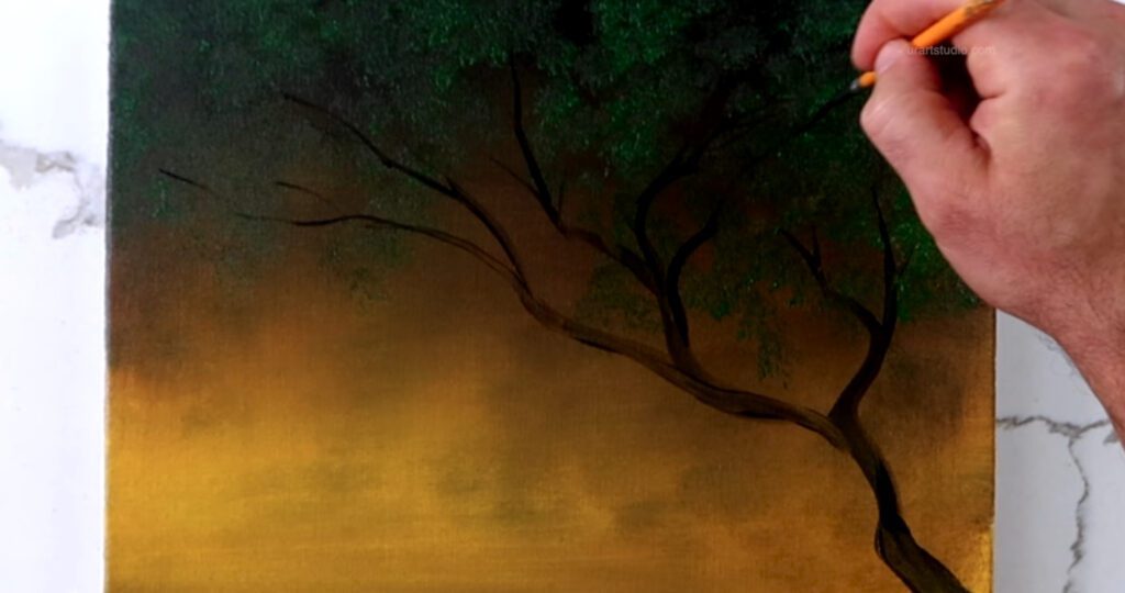 - Enhance the tree trunk and branches with highlights using a mix of Van Dyke Brown and white paint.