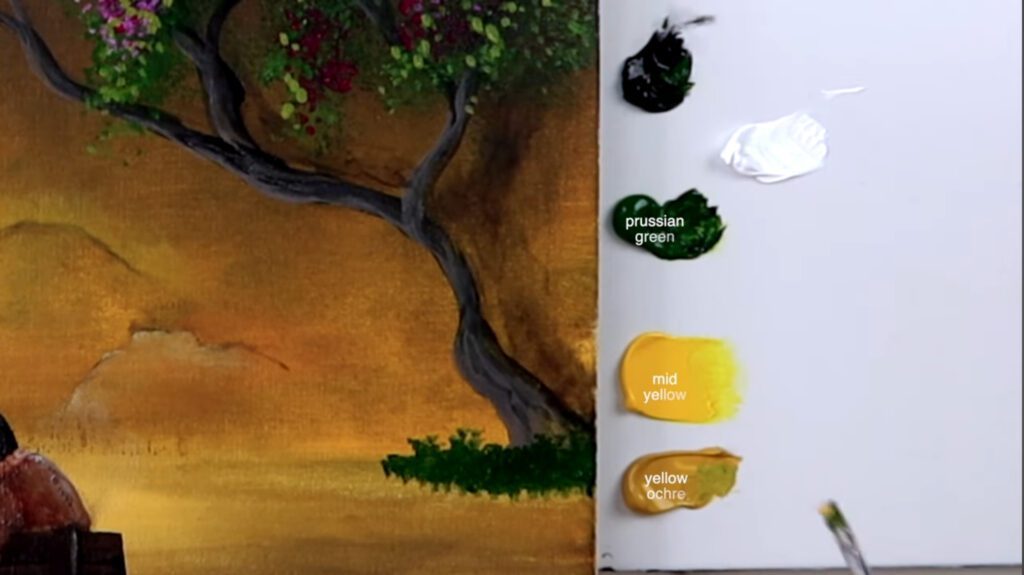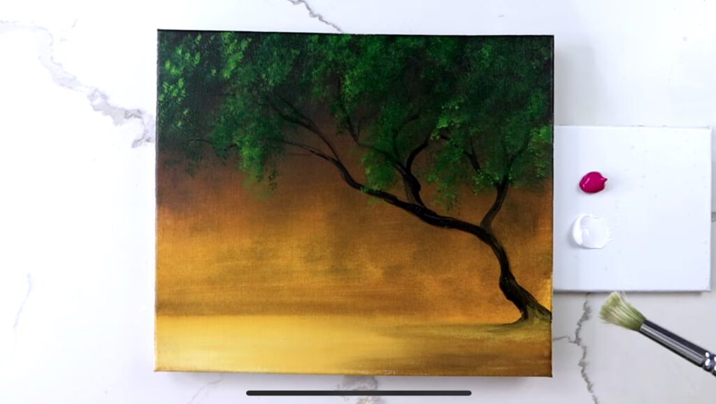 - Use a small round brush to add highlights to the tree canopy, bringing the foliage to life.
