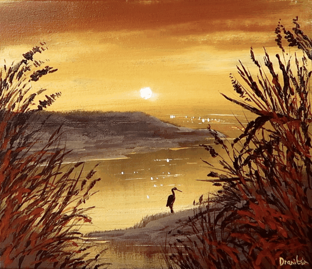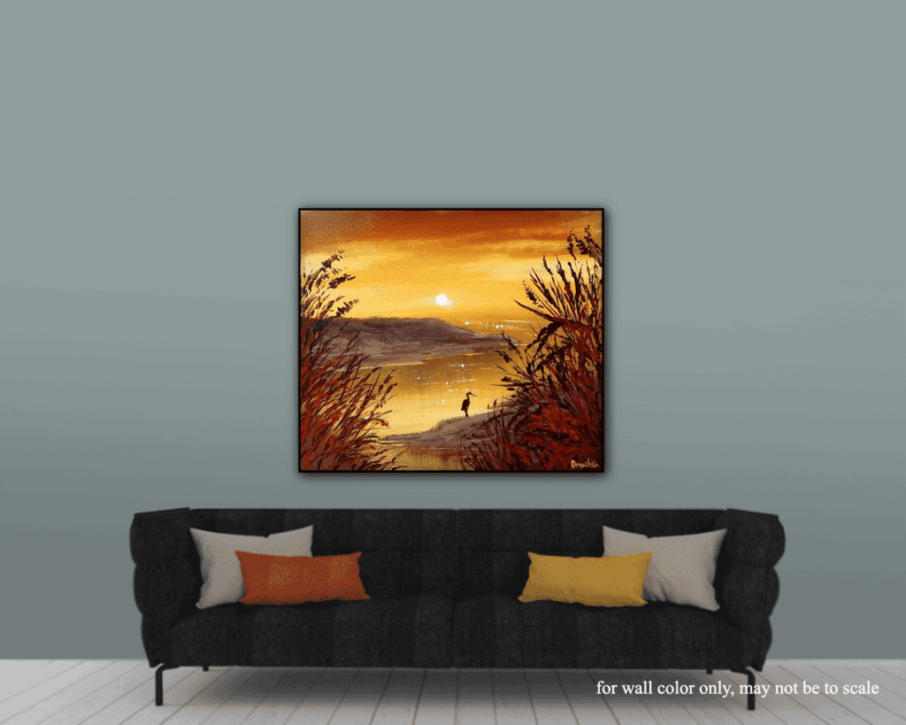 Lake Sunset with Bird Silhouette | Peaceful Island Scene | Tall Grass Landscape | Acrylics
