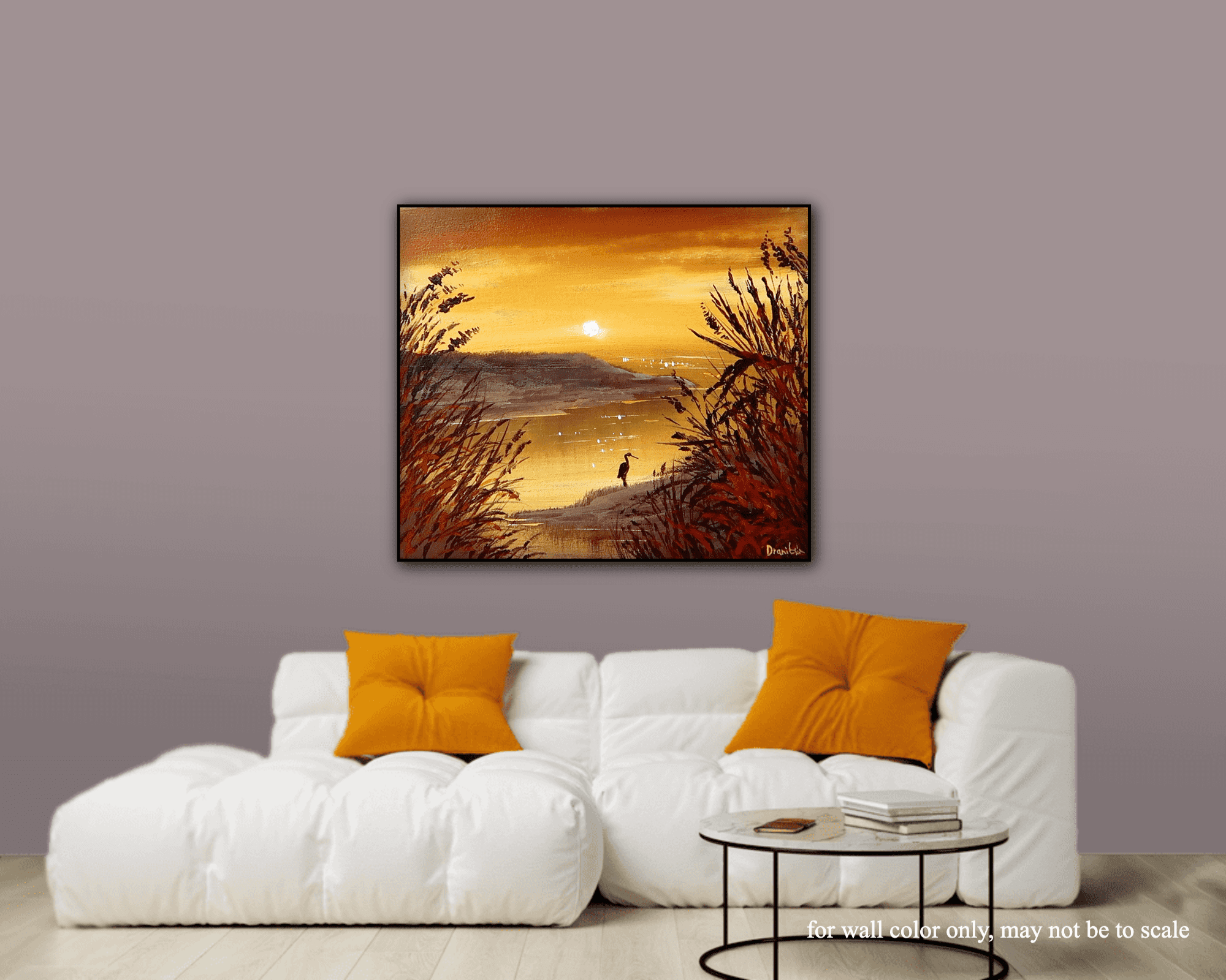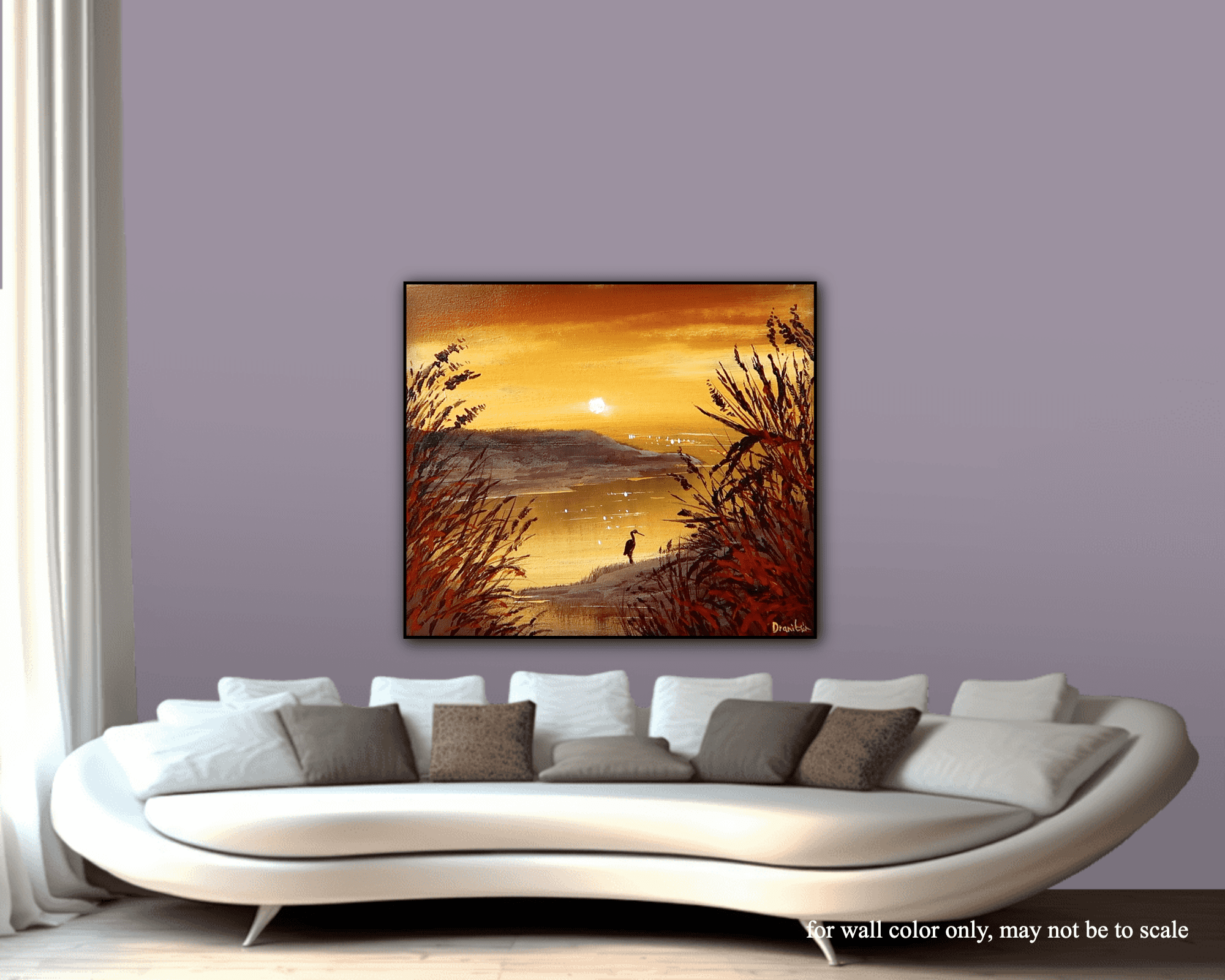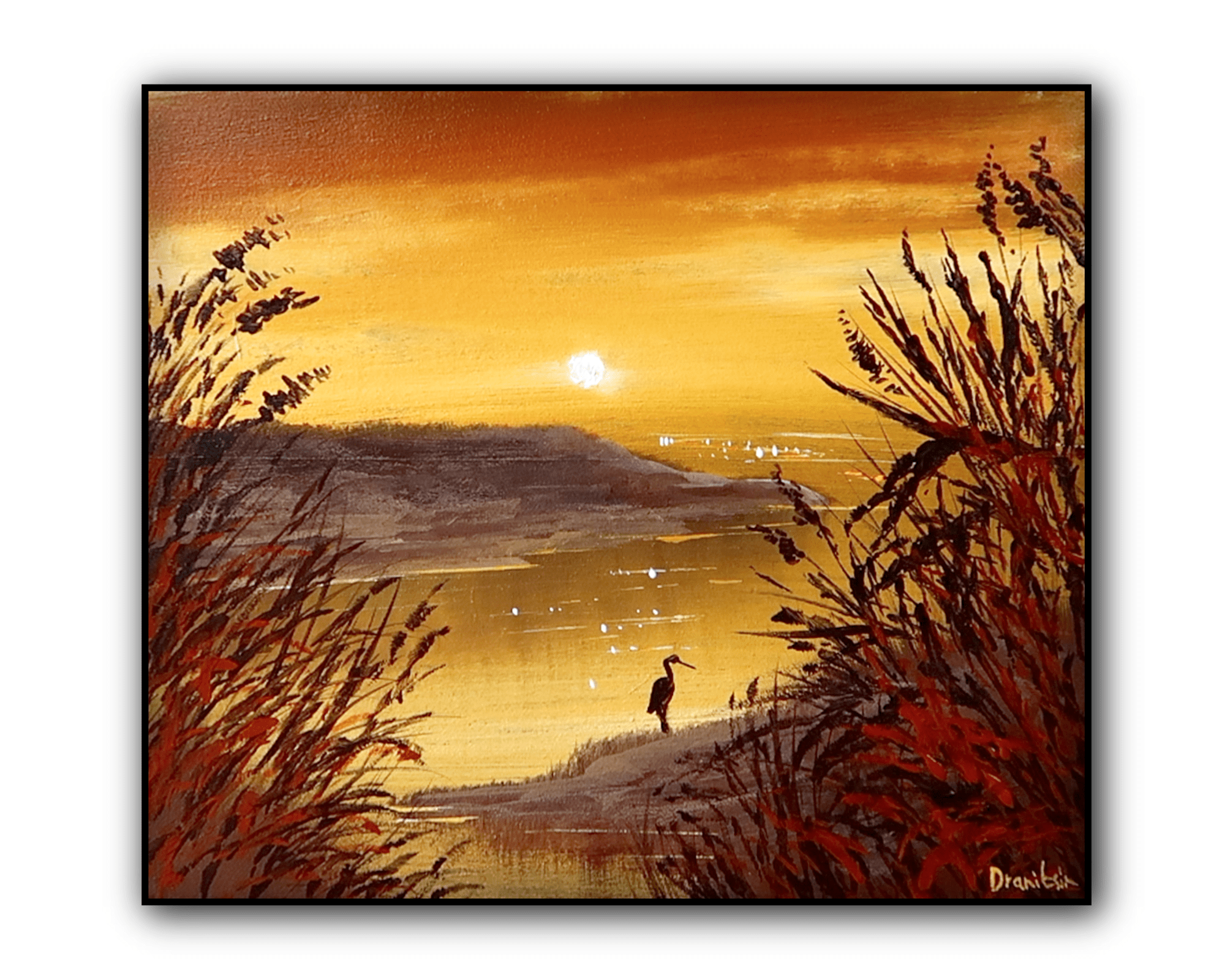 Lake Sunset with Bird Silhouette | Peaceful Island Scene | Tall Grass Landscape | Acrylics