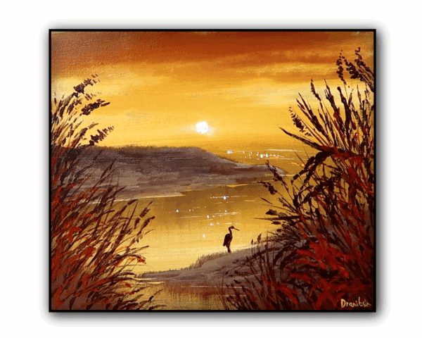 Immerse yourself in the enchanting beauty of nature with our stunning original acrylic painting, “Bird Island Sunset.” This captivating artwork portrays a serene island scene at dusk, where the sky bursts into vibrant hues of orange, pink, and purple, reflecting over calm waters. The silhouette of birds in flight adds a touch of life and freedom to this tranquil landscape, inviting a sense of peace and wonder into your space.