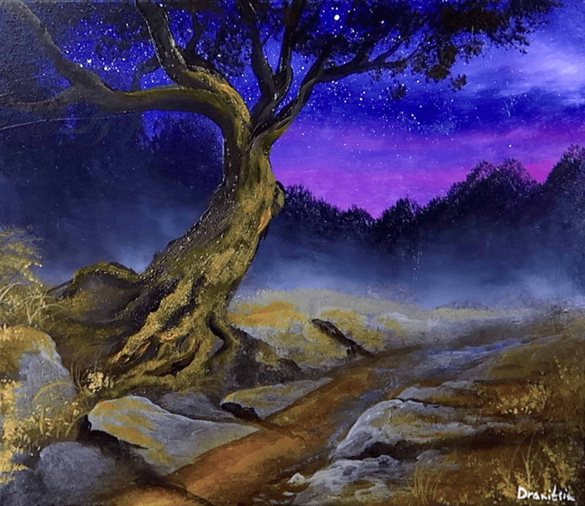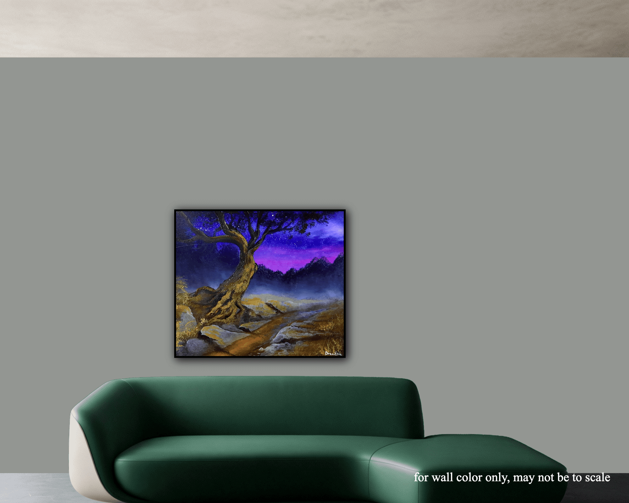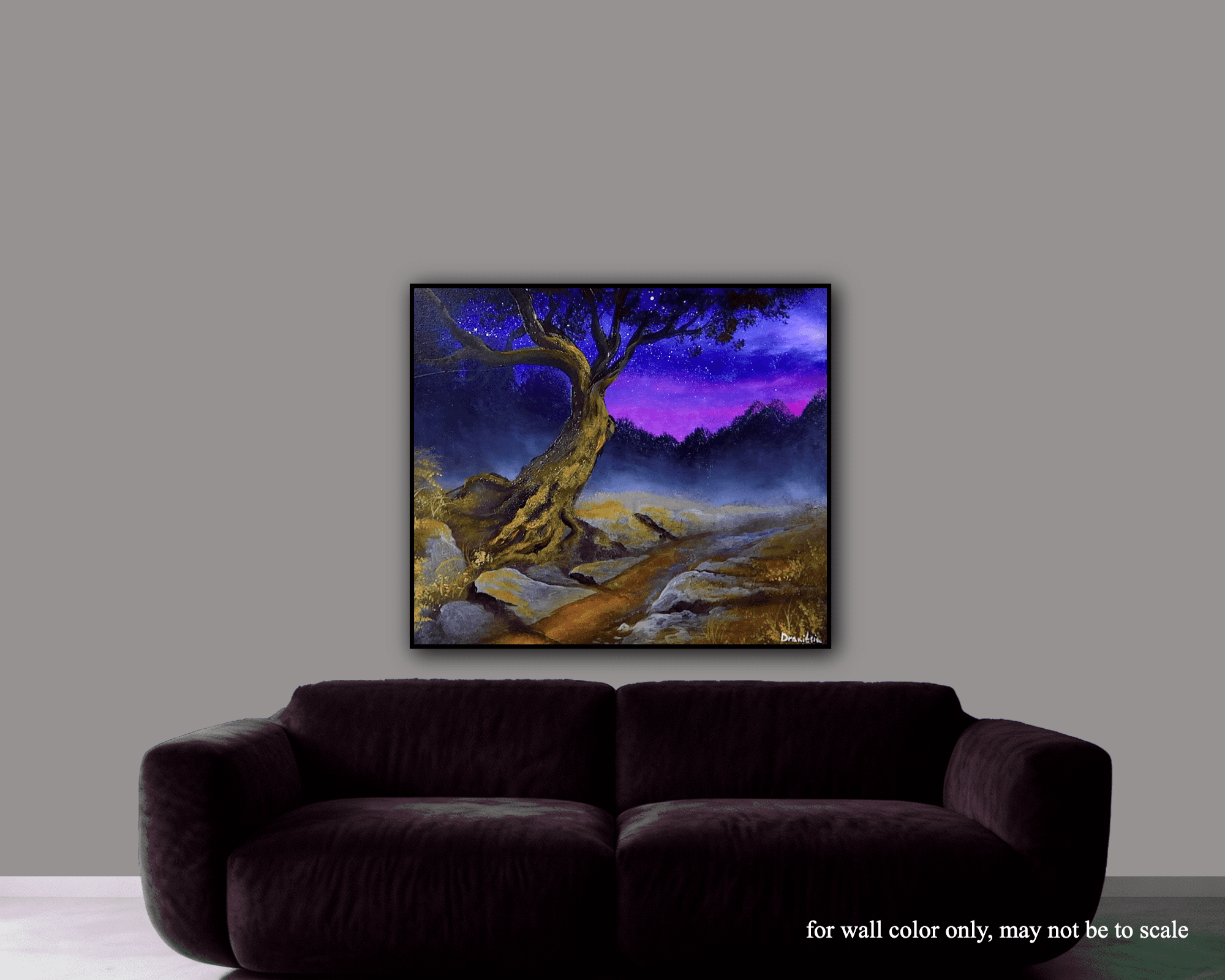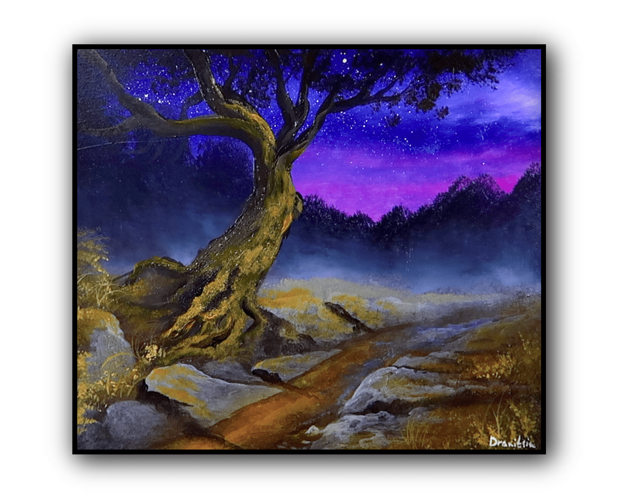 Step into a mysterious and atmospheric world with our original acrylic painting, “Night Tree in the Fog.” This hauntingly beautiful landscape captures the quiet stillness of a solitary tree standing beneath a moonlit sky, wrapped in layers of drifting fog. Deep blues, silvery grays, and soft muted tones blend seamlessly to create a sense of calm, solitude, and gentle mystery. The scene evokes the quiet of nighttime nature, where every shadow holds a story and every whisper of mist feels alive.
