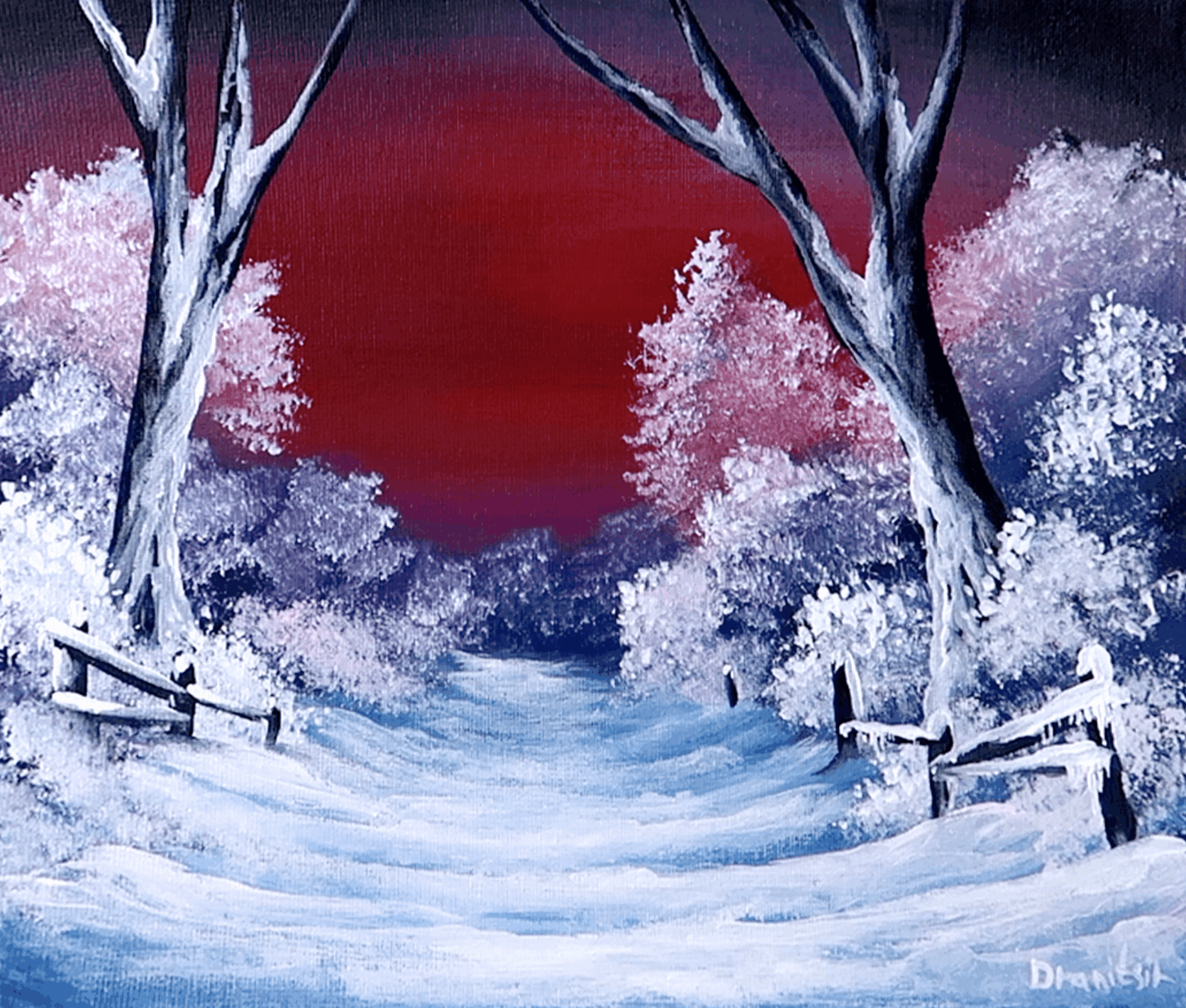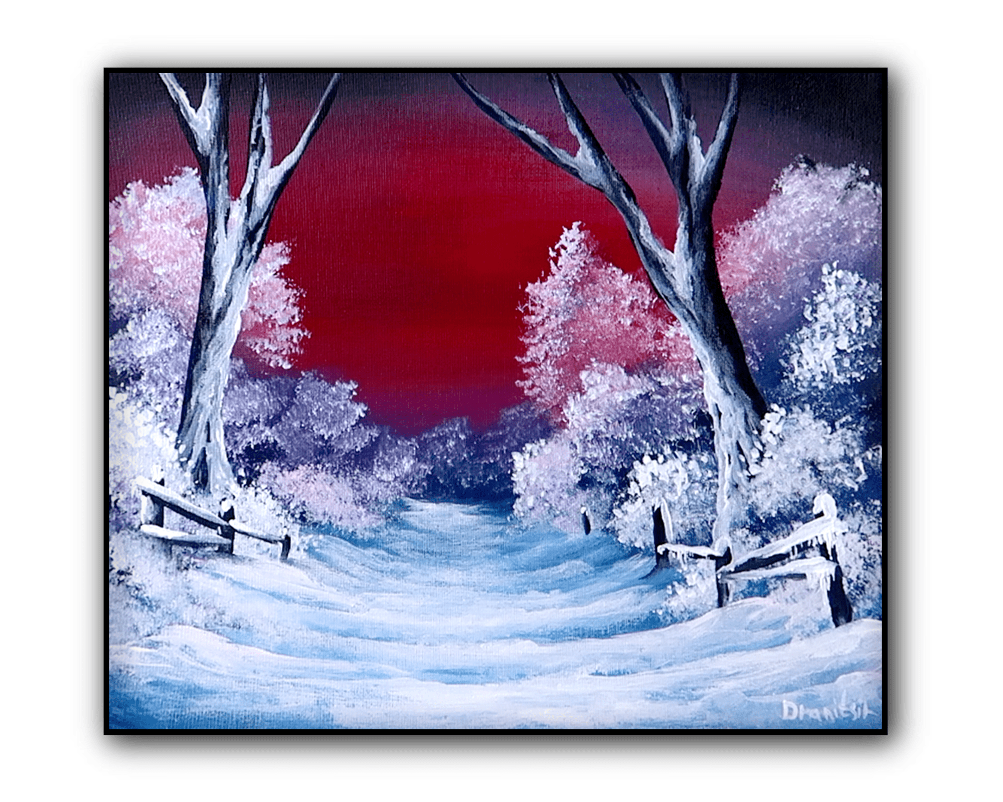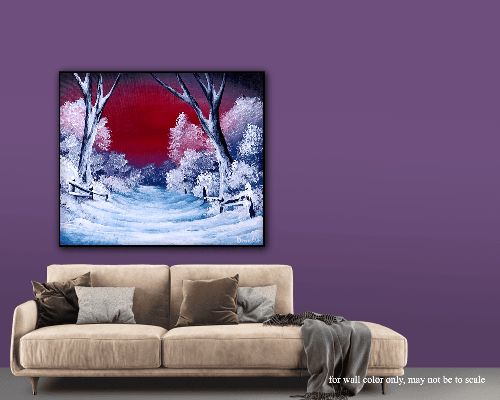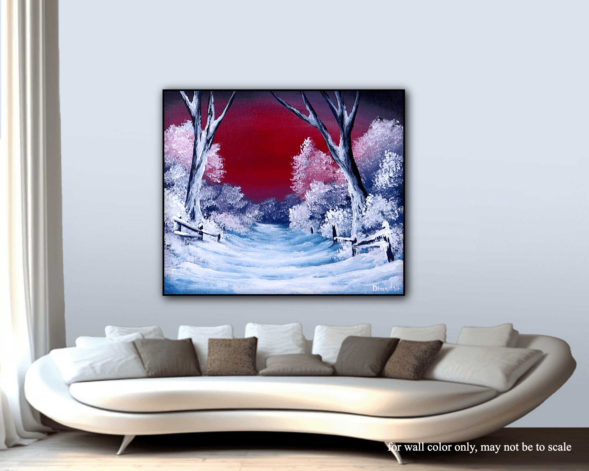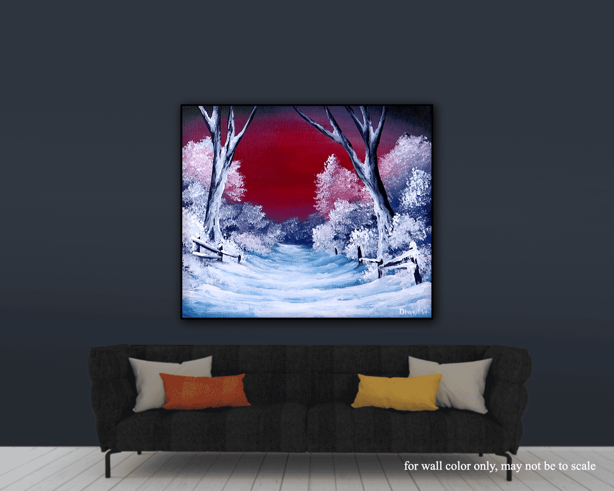 Immerse yourself in the striking beauty of our original acrylic painting, “Red Winter Sky Snowy Path.” This captivating artwork portrays a dramatic winter scene where a fiery red sky contrasts with the serene, snow-covered path below. The bold interplay of vibrant reds, cool whites, and deep shadows creates a powerful visual impact, evoking both the chill of winter and the warmth of a blazing sunset.