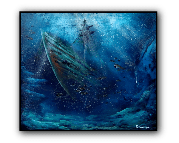 Dive into the mysterious depths of the ocean with our captivating original acrylic painting, “Underwater Shipwreck.” This dramatic seascape invites you into a forgotten world beneath the waves, where a long-lost vessel rests quietly on the ocean floor. Soft diffused light filters through the water, illuminating corals, drifting sands, and the haunting beauty of a ship claimed by time. Shades of deep blues, turquoise, and muted earth tones merge to create an atmosphere that is both tranquil and awe-inspiring.