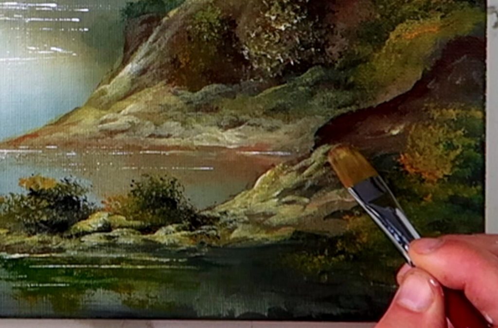 - Add more sparkles and details to pick out shrubs, grass, and glints in the land with short, lively brushstrokes across the forward landform.
