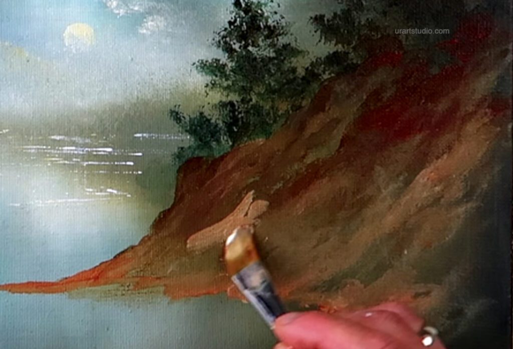 - Utilizing filbert brush loaded with yellow and white mixed colors add more light to the shoreline in a few places to highlight areas where moonlight would touch the shoreline.