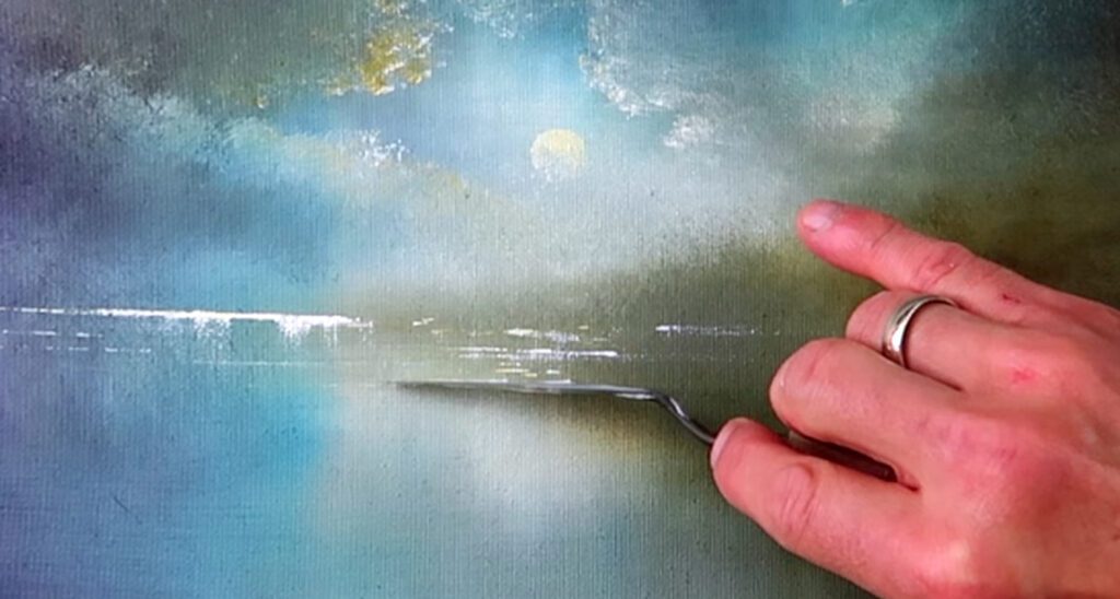 - Using the knife edge, scrape horizontal strokes of white and Indian yellow just under the moon and clouds to create sparkling water.