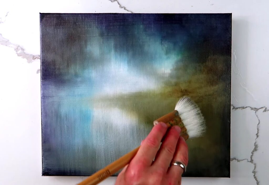 - Using your wide brush, blend upward from the horizon and then downward, always wiping the brush in-between to keep the blending clean.