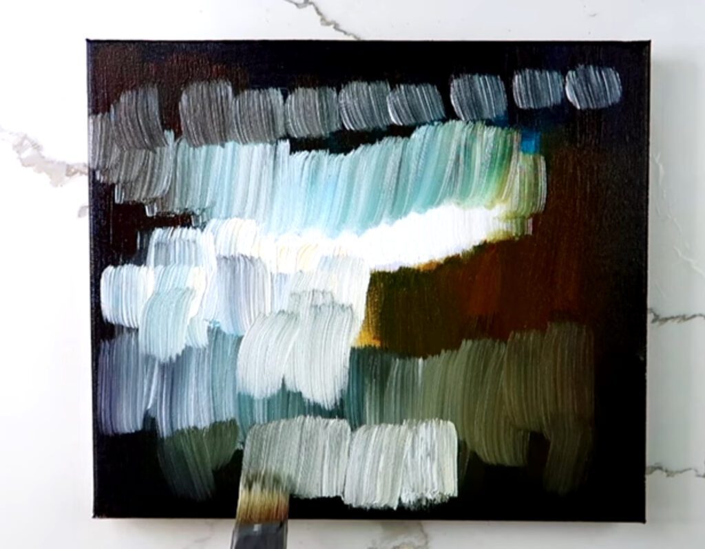 - Using the knife edge, scrape horizontal strokes of white and Indian yellow just under the moon and clouds to create sparkling water.