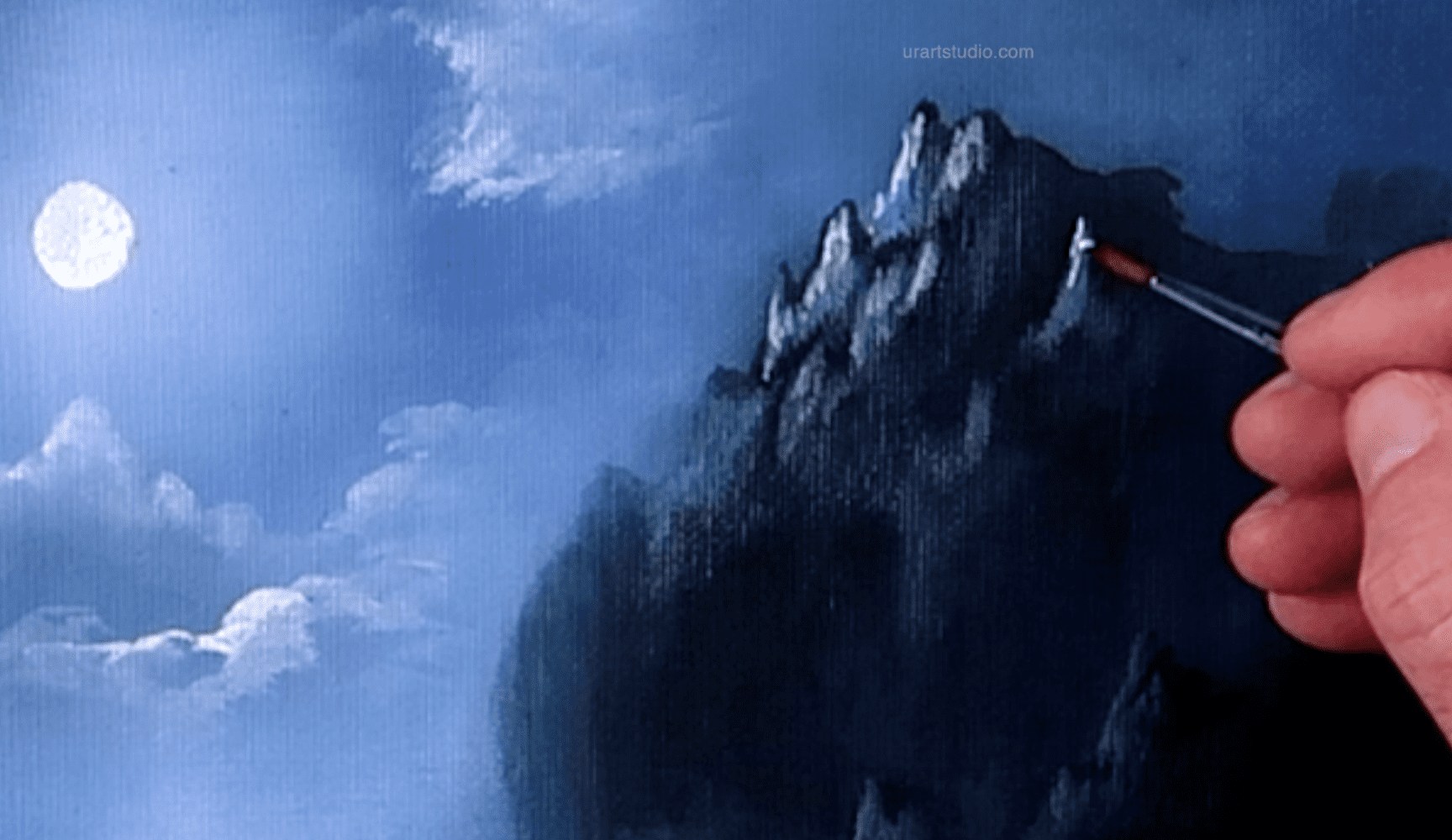 - Application: Use a small Filbert brush to apply highlights to the mountain peaks and ridges. Focus on areas where the moonlight would naturally catch the edges, adding dimension and realism.