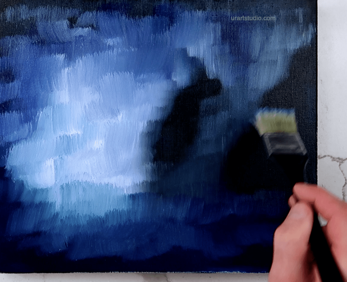 - White in the Center: Using a clean and damp Big Oval brush, load it with pure white paint. Gently blend it into the center, creating a smooth transition from dark to light. This sets the stage for the moonlight effect, where the light will naturally draw the viewer’s eye towards the center. Clean your Big Oval brush once again and gently blend all the colors using a clean oval brush.