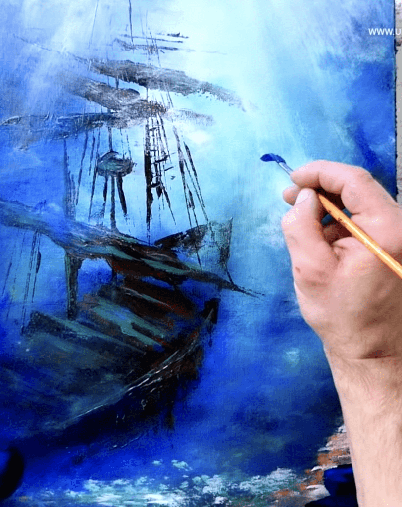To bring this underwater masterpiece to life, Dranitsin lays the foundation with a carefully prepared canvas, ready to absorb the vibrant colors and textures that will soon enliven the scene. With broad strokes, the artist extends a gradient of blues, ranging from deep indigo to pale aquamarine, creating an illusion of descending into the ocean’s depths. This gradation establishes a mysterious ambiance, setting the stage for the sunken ship to emerge.